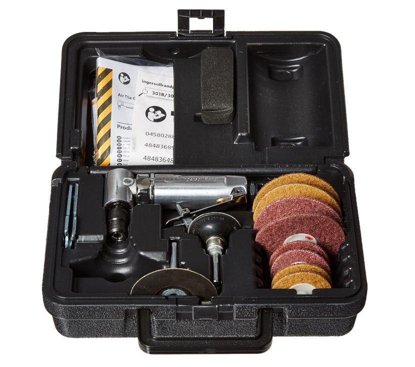 - Includes: 301B Air Angle Die Grinder, (2) 2" coarse pads, (2) 2" medium pads, (2) 3" coarse pads, (2) 3" medium pads, Blow-molded case, 1/4" and 6mm collets, (2) Wrenches and Manuals