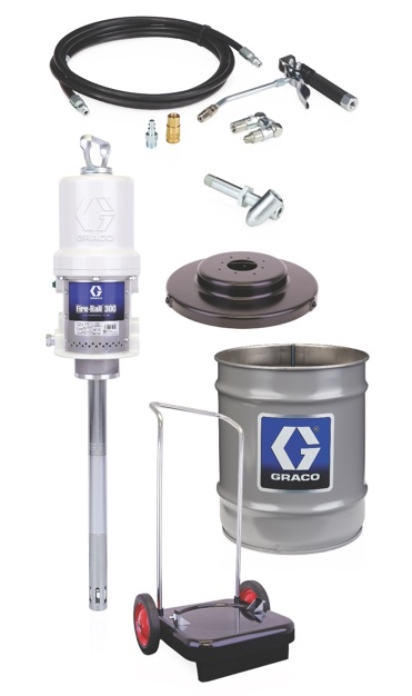 Fire-Ball® 300 Series 50:1 25 to 50 lb. (11.3 to 23 kg) Grease Pump - Portable Pail Dispenser PackageAs the mainstay pump in the industry for decades, the reputation of Fire-Ball is unrivaled. Built to withstand the test of time with fewer moving parts, our flagship pump is built to extend uptime so customers can be more productive. The durable pumps are renowned for their durability, with pumps built decades ago still operating efficiently.Install the Fire-Ball 300 50:1 in grease dispense applications.Reliable Flow - A 3 inch (76.2 mm) differential air motor and the double-acting pump design provides reliable fluid flow and accurate dispense.Durable - Thick cast aluminum air motor housing offers unmatched durability.Fewer Repairs - Fewer moving parts in the air motor assembly means less downtime and low repair cost.Extended Seal Life - In-line pump design aligns the air motor piston and fluid piston rods to maximize seal life.Reduce Downtime - Displacement rods have minimal wear due to a proprietary Graco manufacturing process.Superior Sealing - Non-metallic poppet valves offer positive sealing performance, even with contaminated "dirty" air environments for long life without repair.Reduced Icing - Large air porting design provides efficient use of compressed air supply for continuous pump operation and reduced icing.Corrosion-Resistant - Corrosion-resistant design utilizes liquid salt nitriding, nickel plating, stainless steel, aluminum and chrome on key components for longer life.