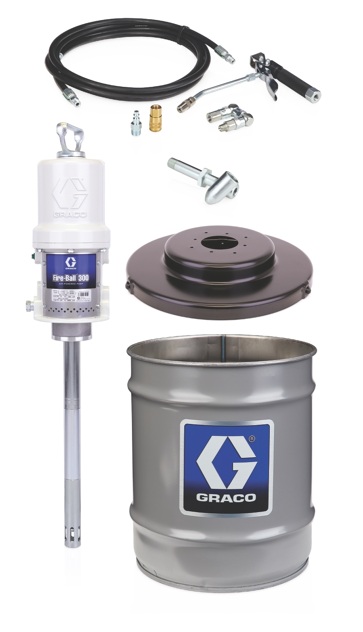 Fire-Ball® 300 Series 50:1 35 to 50 lb. (16 to 23 kg) Grease Pump - Stationary Pail Dispenser PackageAs the mainstay pump in the industry for decades, the reputation of Fire-Ball is unrivaled. Built to withstand the test of time with fewer moving parts, our flagship pump is built to extend uptime so customers can be more productive. The durable pumps are renowned for their durability, with pumps built decades ago still operating efficiently.Install the Fire-Ball 300 50:1 in grease dispense applications.Reliable Flow - A 3 inch (76.2 mm) differential air motor and the double-acting pump design provides reliable fluid flow and accurate dispense.Durable - Thick cast aluminum air motor housing offers unmatched durability.Fewer Repairs - Fewer moving parts in the air motor assembly means less downtime and low repair cost.Extended Seal Life - In-line pump design aligns the air motor piston and fluid piston rods to maximize seal life.Reduce Downtime - Displacement rods have minimal wear due to a proprietary Graco manufacturing process.Superior Sealing - Non-metallic poppet valves offer positive sealing performance, even with contaminated "dirty" air environments for long life without repair.Reduced Icing - Large air porting design provides efficient use of compressed air supply for continuous pump operation and reduced icing.Corrosion-Resistant - Corrosion-resistant design utilizes liquid salt nitriding, nickel plating, stainless steel, aluminum and chrome on key components for longer life.